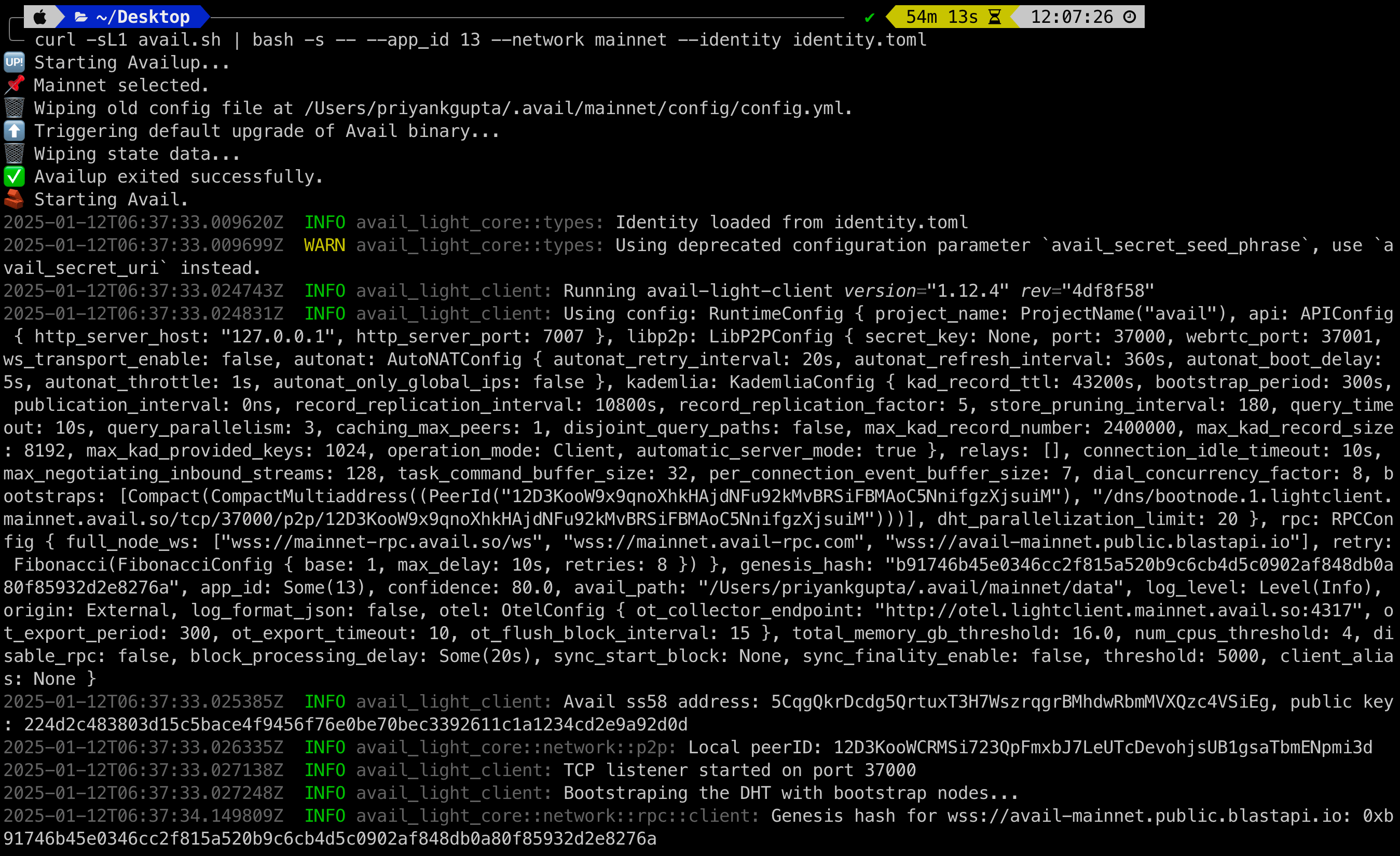 2024-03-20T10:50:25.528628Z INFO avail_light::light_client: Processing finalized block block_number=562690 block_delay=20 2024-03-20T10:50:25.528706Z INFO avail_light::light_client: Random cells generated: 10 block_number=562690 cells_requested=10 2024-03-20T10:50:26.069497Z INFO avail_light::network: Cells fetched from DHT block_number=562690 cells_total=10 cells_fetched=0 cells_verified=0 fetch_elapsed=540.755792ms proof_verification_elapsed=2.208µs 2024-03-20T10:50:28.322706Z INFO avail_light::network: Cells fetched from RPC block_number=562690 cells_total=10 cells_fetched=10 cells_verified=10 fetch_elapsed=2.232714917s proof_verification_elapsed=20.404208ms 2024-03-20T10:50:28.322987Z INFO avail_light::light_client: Confidence factor: 99.90234375 block_number=562690 confidence=99.90234375 2024-03-20T10:50:28.323134Z INFO avail_light::light_client: Sleeping for 14.61143875s seconds 2024-03-20T10:50:28.323154Z INFO avail_light::api::v2: Message published to clients topic=ConfidenceAchieved published=0 failed=0 2024-03-20T10:50:28.859369Z INFO avail_light::network::p2p::event_loop: Cell upload success rate for block 562690: 0/10. Duration: 0 2024-03-20T10:50:41.535425Z INFO avail_light::network::rpc::subscriptions: New justification at block no.: 562692, hash: 0x3b602253298ce9bec9b5b8f0c8767f14502ccaa17a003dfba77f9d90edeaf5da 2024-03-20T10:50:41.709011Z INFO avail_light::network::rpc::subscriptions: Header no.: 562692 2024-03-20T10:50:41.709557Z INFO avail_light::network::rpc::subscriptions: Number of matching signatures: 5/7 for block 562692, set_id 223 2024-03-20T10:50:41.709574Z INFO avail_light::network::rpc::subscriptions: Storing finality checkpoint at block 562692 2024-03-20T10:50:41.709908Z INFO avail_light::network::rpc::subscriptions: Sending finalized block 562692 2024-03-20T10:50:41.709966Z INFO avail_light::api::v2: Message published to clients topic=HeaderVerified published=0 failed=0 2024-03-20T10:50:42.936699Z INFO avail_light::light_client: Processing finalized block block_number=562691 block_delay=20 2024-03-20T10:50:42.936761Z INFO avail_light::light_client: Random cells generated: 10 block_number=562691 cells_requested=10 2024-03-20T10:50:43.472932Z INFO avail_light::network: Cells fetched from DHT block_number=562691 cells_total=10 cells_fetched=0 cells_verified=0 fetch_elapsed=536.136083ms proof_verification_elapsed=3.042µs 2024-03-20T10:50:46.513570Z INFO avail_light::network: Cells fetched from RPC block_number=562691 cells_total=10 cells_fetched=10 cells_verified=10 fetch_elapsed=3.022786041s proof_verification_elapsed=17.810542ms 2024-03-20T10:50:46.513706Z INFO avail_light::light_client: Confidence factor: 99.90234375 block_number=562691 confidence=99.90234375 2024-03-20T10:50:46.513785Z INFO avail_light::light_client: Sleeping for 15.195224667s seconds 2024-03-20T10:50:46.513795Z INFO avail_light::api::v2: Message published to clients topic=ConfidenceAchieved published=0 failed=0 2024-03-20T10:50:47.056255Z INFO avail_light::network::p2p::event_loop: Cell upload success rate for block 562691: 0/10. Duration: 0